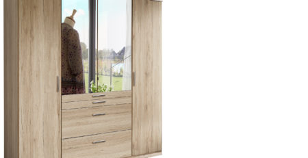 The Aachen 3 Door 4 Drawer Wardrobe offers a combination of hanging, shelving and drawer space one drawer being a fitted accessory drawer. The wardrobe has aluminium finish handles along with the centre door being mirrored which give the wardrobe a modern look. Includes 1 Shelf in Top and Hanging Rail in 2 plain Door Section, 3 Shelves in 1 Door Mirrored Section.All TJ’S products are designed and built in Germany and constructed to a high standard. All TJ’S ranges are subject to full quality checks before leaving the factory to ensure a consistent standard of product.