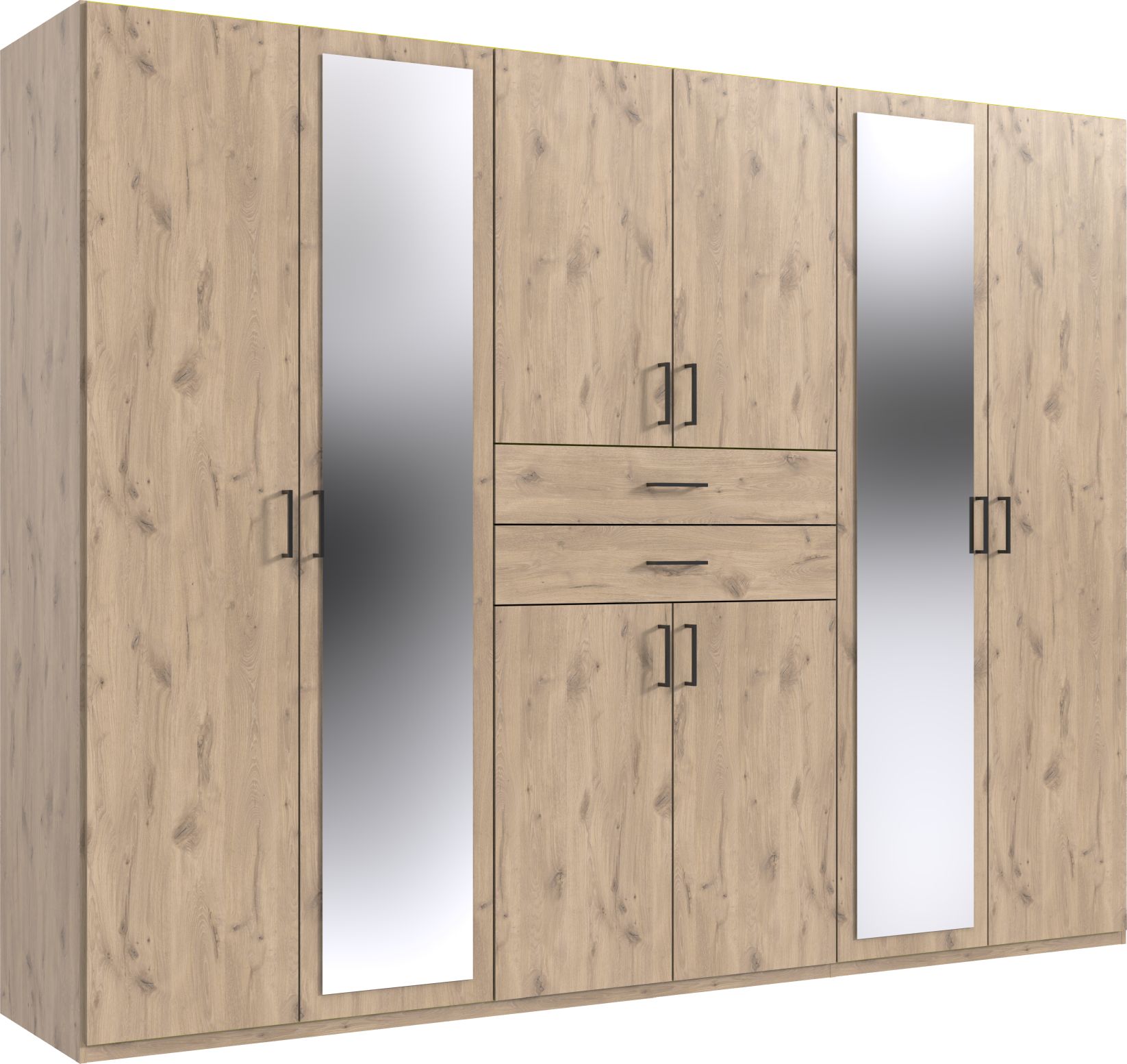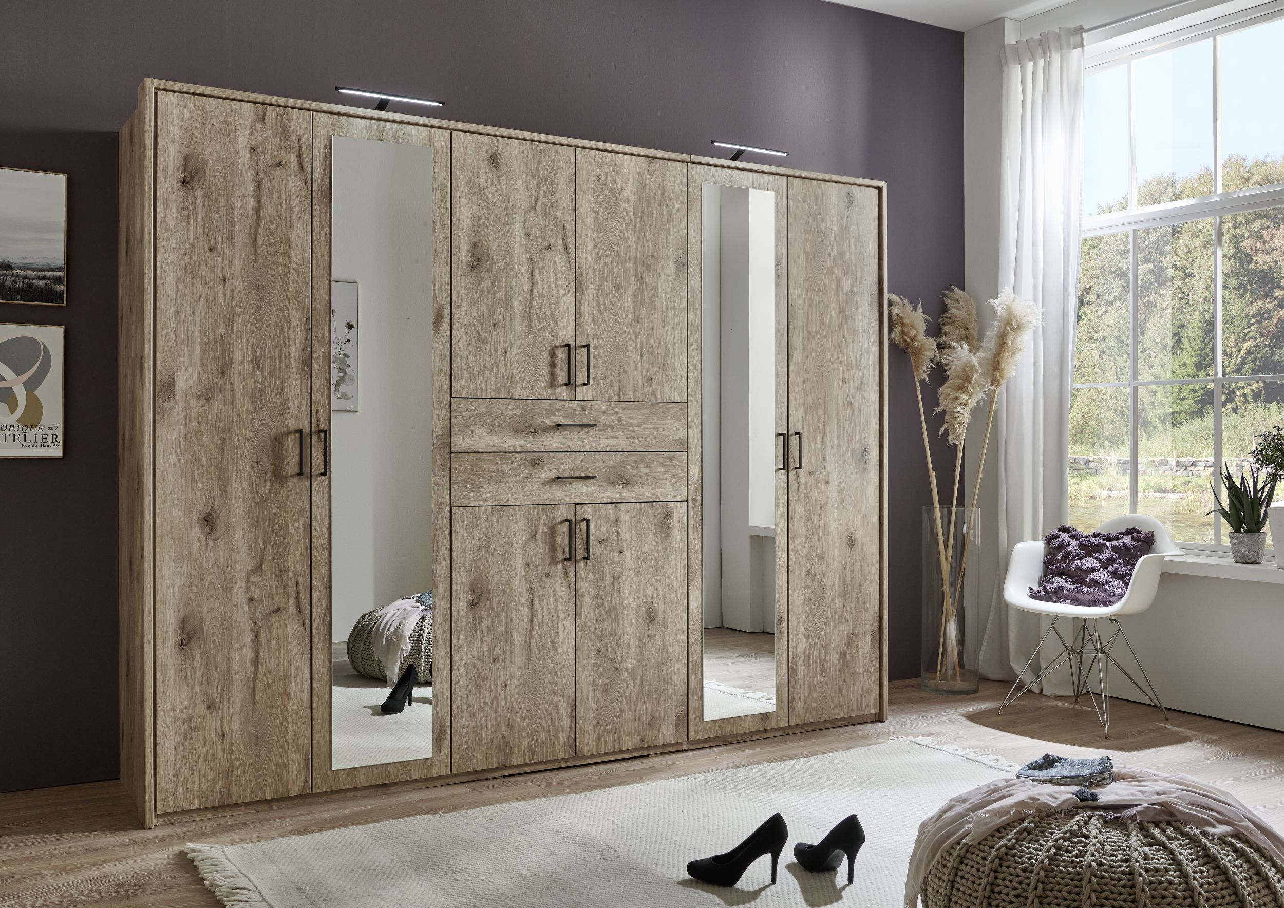 The Dillingen 5 Door wardrobe has a sleek and contemporary look,finished with Mirrored door.The wardrobe has trendy handles which gives the wardrobe a modern look .The wardrobe has two hanging rail and a top storage shelf and it has total 5 shelves divide in three section.