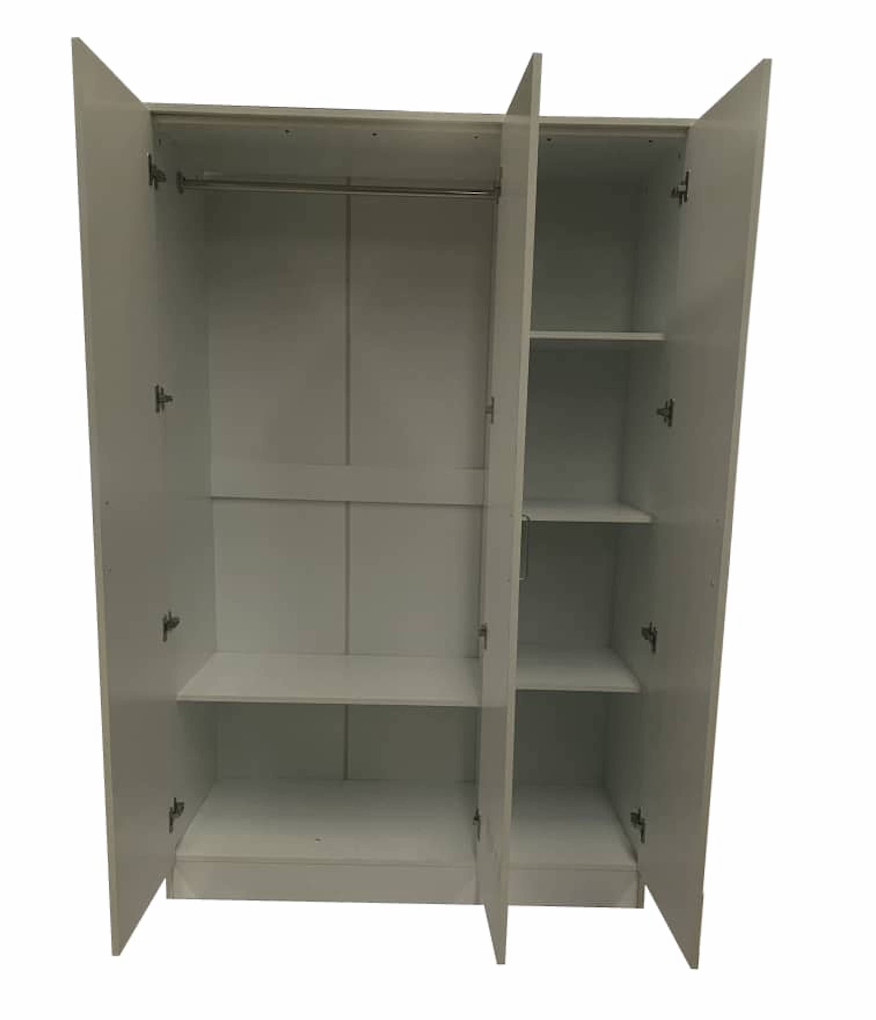 The venice 3 door wardrobe Simple and smart! When all you need is a wardrobe with all the basic functions. .The wardrobe has trendy handles .The wardrobe has ONE hanging rail , Four storage shelves