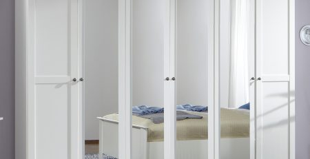 The chalet 5 Door wardrobe has a sleek and contemporary look,finished White carcase and Mirror doors.The wardrobe has trendy handles which gives the wardrobe a modern look .The wardrobe has three hanging rail, two large shelves  and one small shelf divides in three sections