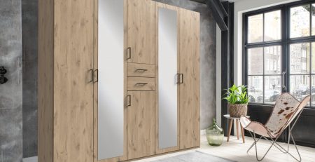 The Dillingen 6 Door wardrobe has a sleek and contemporary look,finished with Mirrored door.The wardrobe has trendy handles which gives the wardrobe a modern look .The wardrobe has two hanging rail and a top storage shelf and it has total 5 shelves divide in three section.