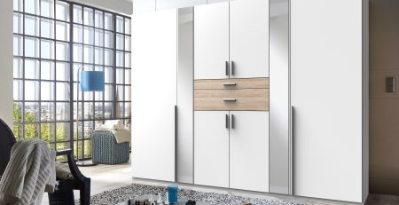 The Odessa 5 Door wardrobe has a sleek and contemporary look,finished with Mirrored door.The wardrobe has trendy handles which gives the wardrobe a modern look .The wardrobe has two hanging rail and a top storage shelf and it has total 5 shelves divide in three section.