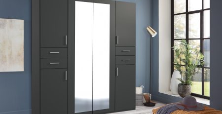 The vegas graphite 5 Door wardrobe has a sleek and contemporary look,finished with Mirrored door.The wardrobe has trendy handles which gives the wardrobe a modern look .The wardrobe has 2 hanging rail and total 8 shelves divide in four section.
